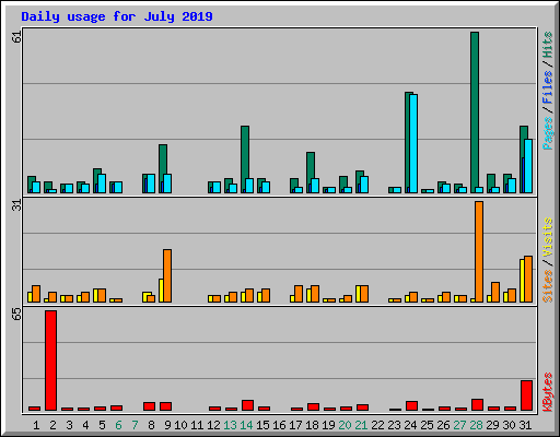 | Day | Hits | Files | Pages | Visits | Sites | KBytes | ||||||